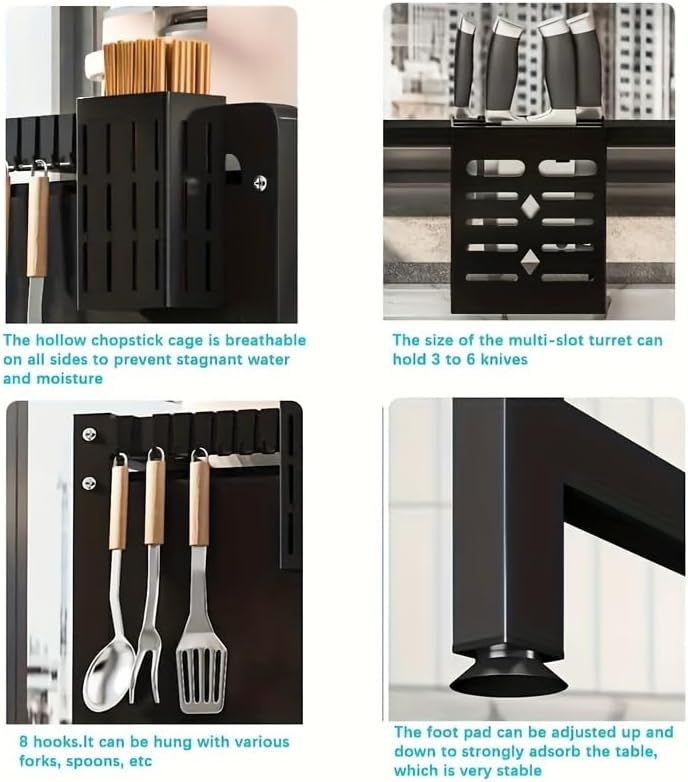 Livré avec de nombreux accessoires pratiques (panier de rangement, support à couteaux, support pour planche à découper, porte-ustensiles et 6 crochets), il vous aide à garder une cuisine parfaitement organisée et fonctionnelle.